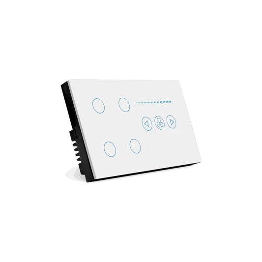 The switch features a sleek, modern design with a glass-like finish. Both the black and white versions show four circular touch-sensitive buttons for controlling lights (implied by “4gang”) and a separate set of controls for fan speed regulation, which appear to be touch-based as well, possibly with an indicator for the current speed setting. The product is designed to “Match with Fan Stepless Speed Regulation Motor,” indicating precise control over fan speed.